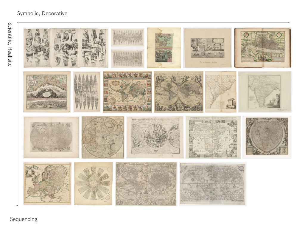 The maps were reorganised along a spectrum from abstract/decorative to scientific/realistic. This method differentiates the maps according to their projections, content and function.