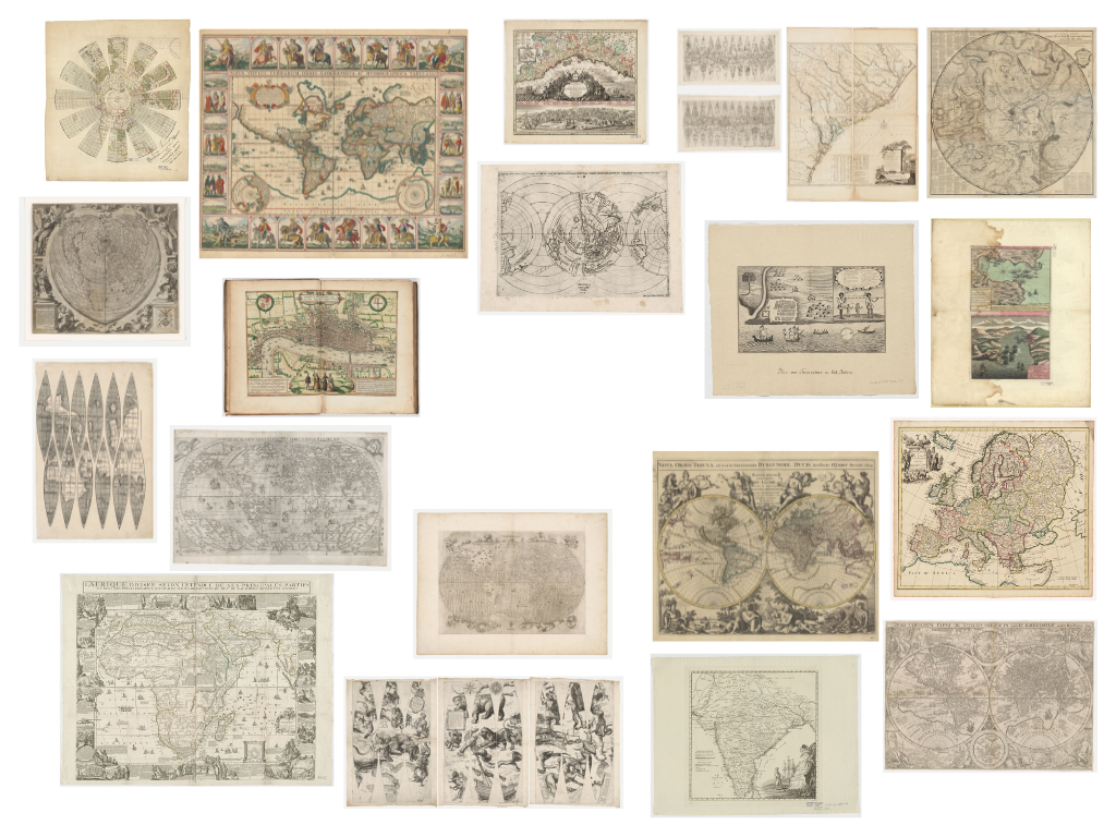 The first row features celestial maps and those that include illustrations with inaccurate perspectives and minimal information about terrestrial landscapes. The second row presents maps in which the continents begin to take on shapes we’re familiar today, yet they remain adorned with mythological figures and creatures (e.g. personifications of natural forces on the corners, aka anthropomorphic figures). The last row consists of maps that demonstrate a more systematic representation of spatial relationships, emphasising the relativity of positions and scale (e.g. use of latitude & longitude). In general, sequencing the maps in this way reveals the historical shift of map-making.